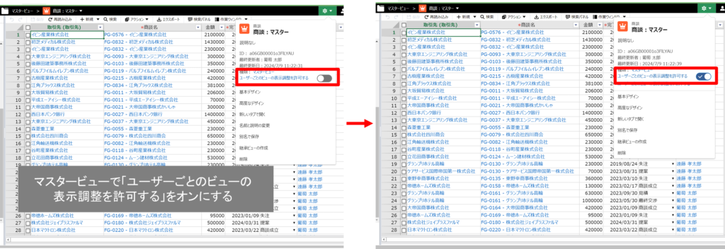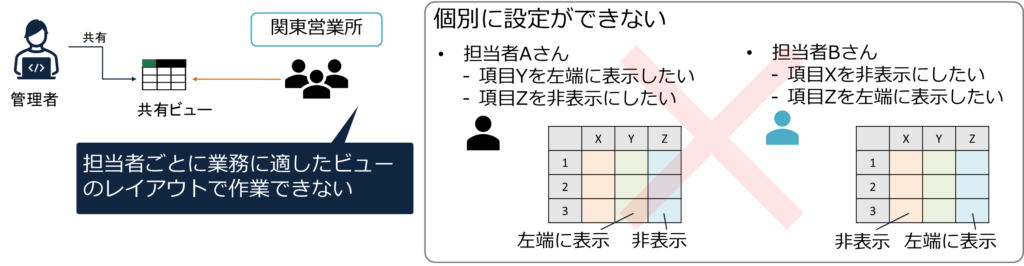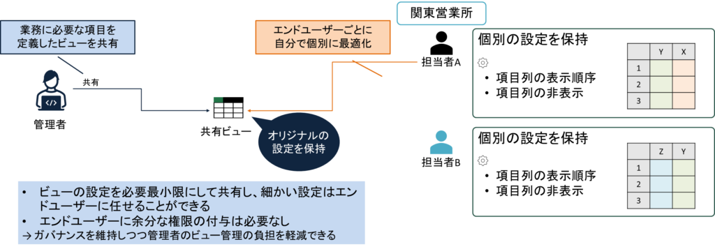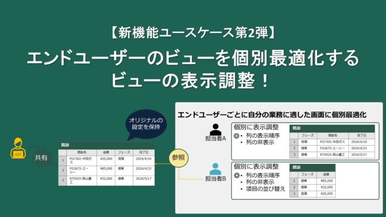 ビューの表示調整では、ビューのデザイン変更権限を持たないエンドユーザーが、システム管理者から共有されたビューを自分の業務に合わせて最適化することができます。