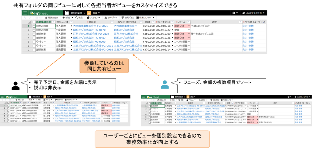 エンドユーザーは共有されたRaySheetの継承ビューを自分の業務に最適化したビューにカスタマイズできる